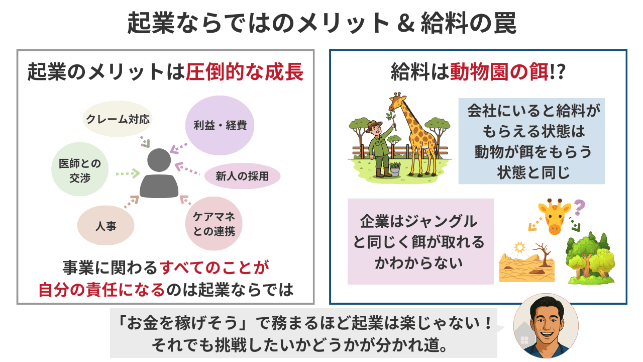 3. 成長の対価: 訪問看護での起業は「圧倒的に成長できる」が、その成長の裏には「餌が取れなければ生きていけない」という厳しい現実がある。