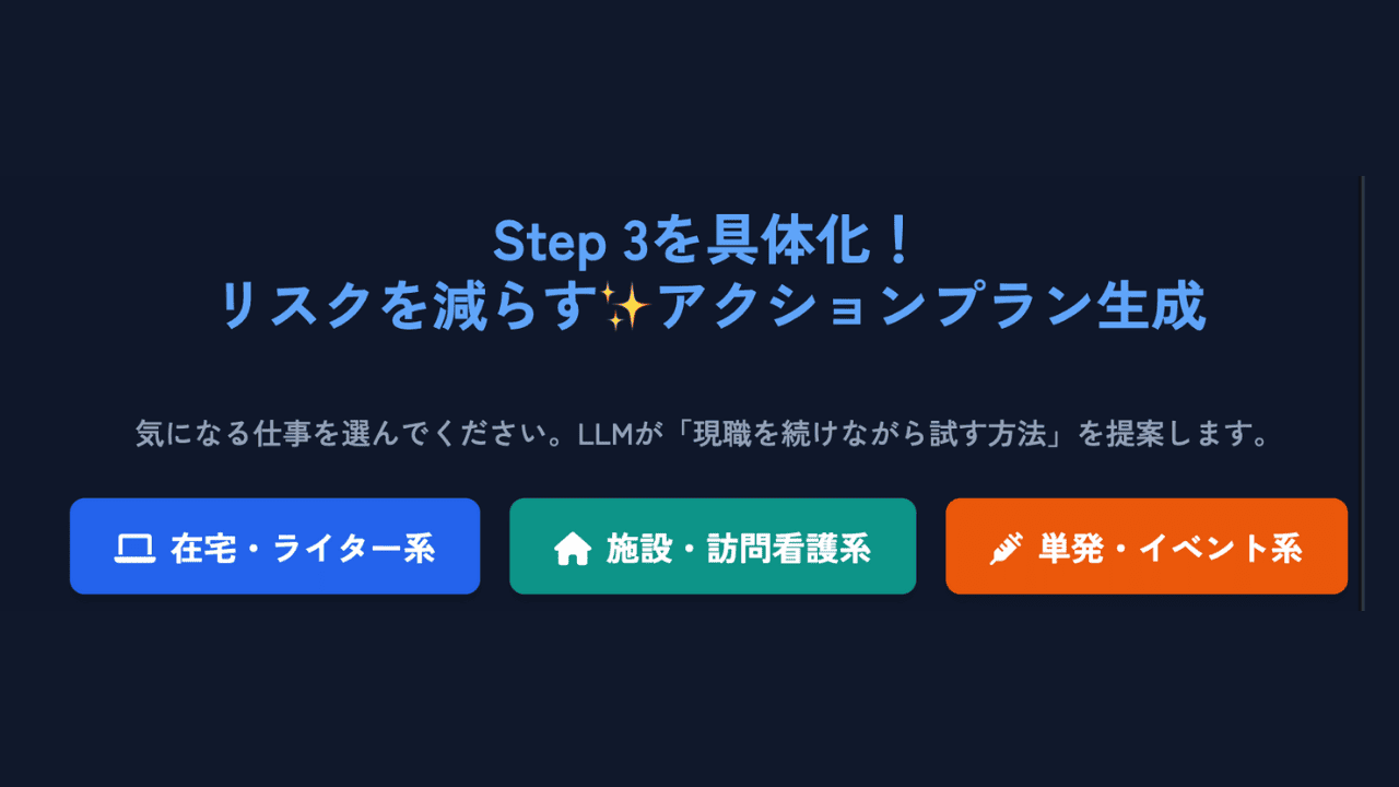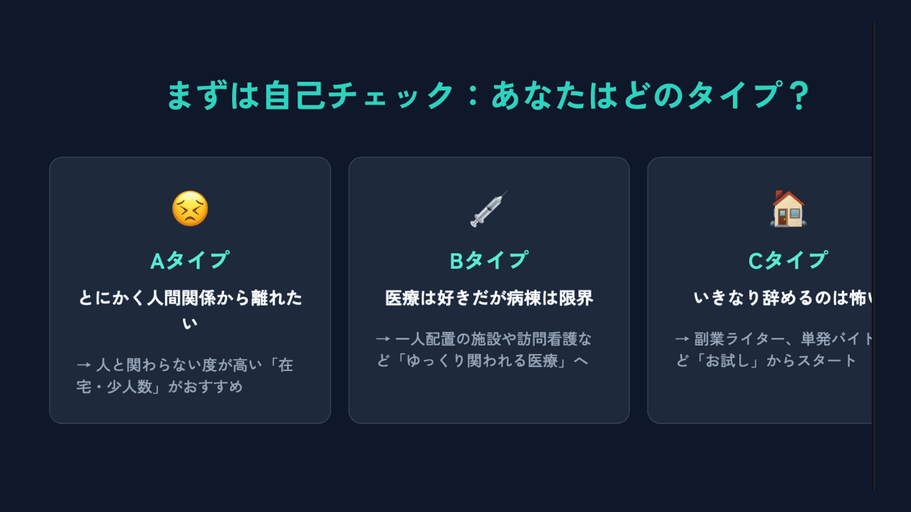 → 一人配置・少人数の介護施設や訪問系など、「ゆっくり関われる医療」が向きやすい。 - Cタイプ:今すぐ辞めるのは怖いので、副業・在宅から試したい