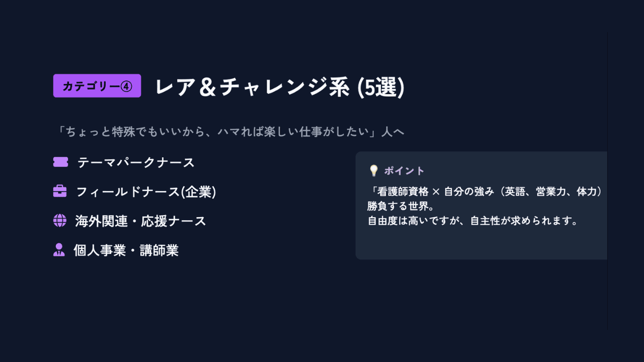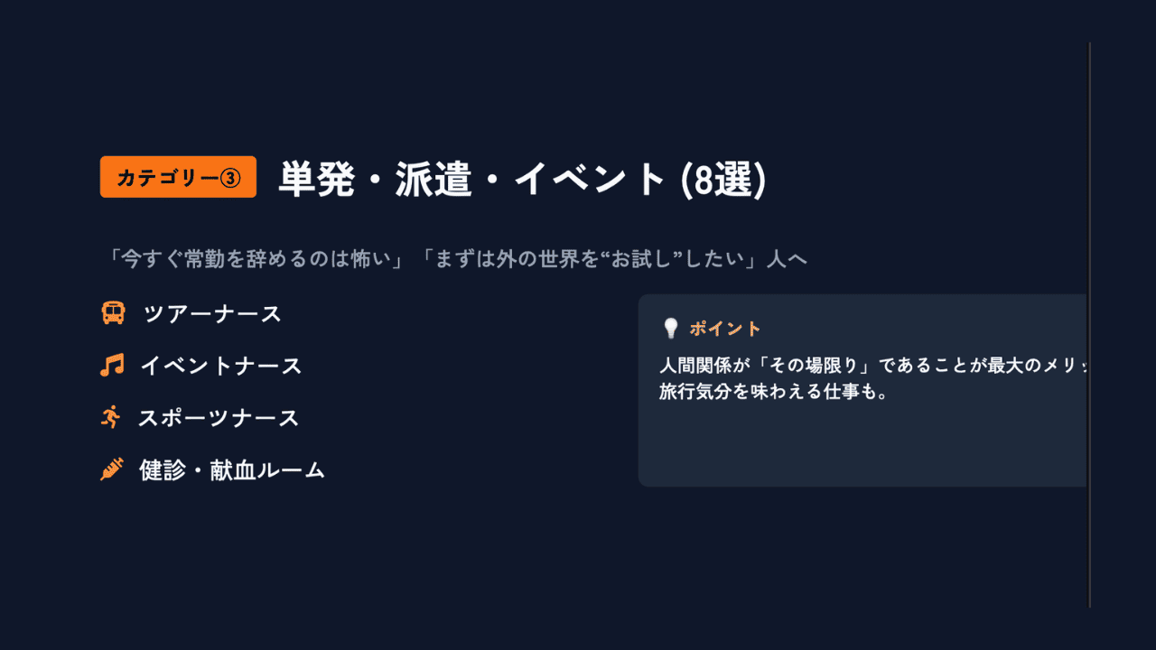 例)ツアーナース、イベントナース、スポーツナース、健診バイト など