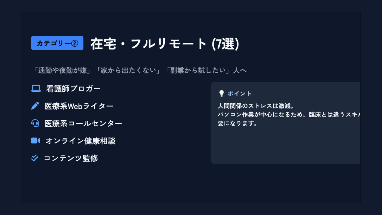 → 看護師ライター、ブロガー、在宅コールセンター、オンライン相談などが候補。