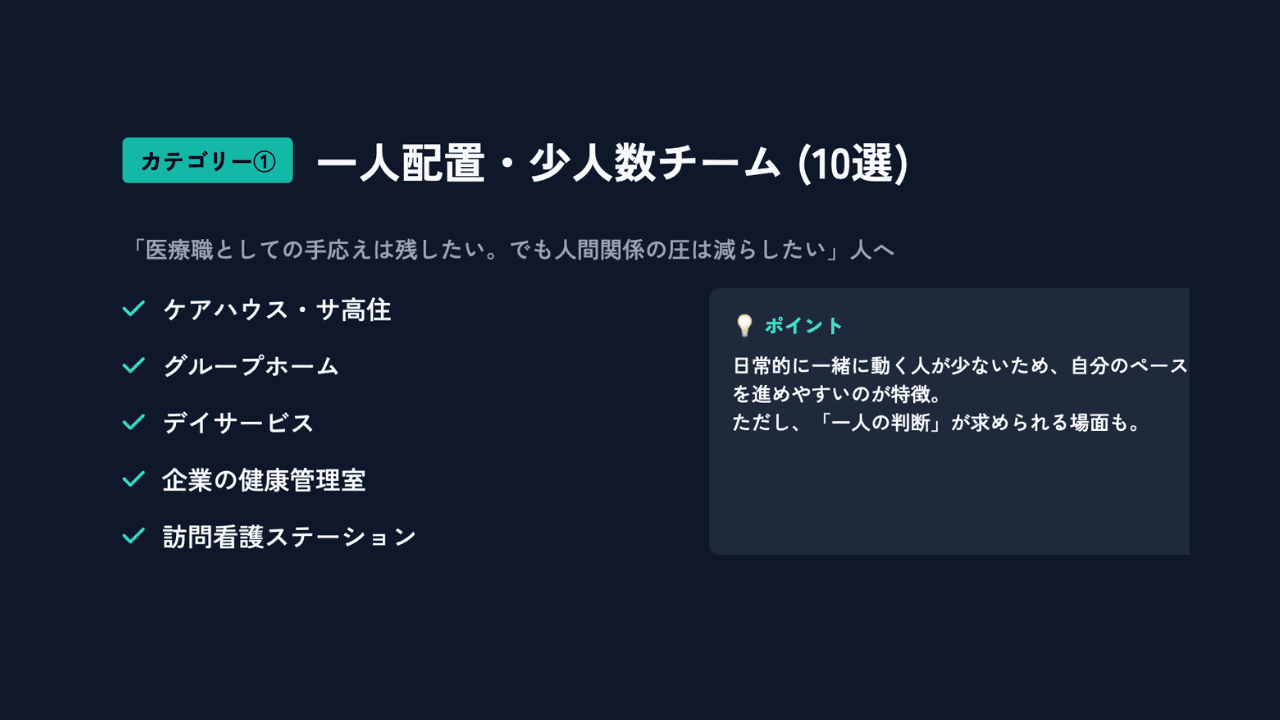 そんな人向けの、少人数・一人配置になりやすい職場です。