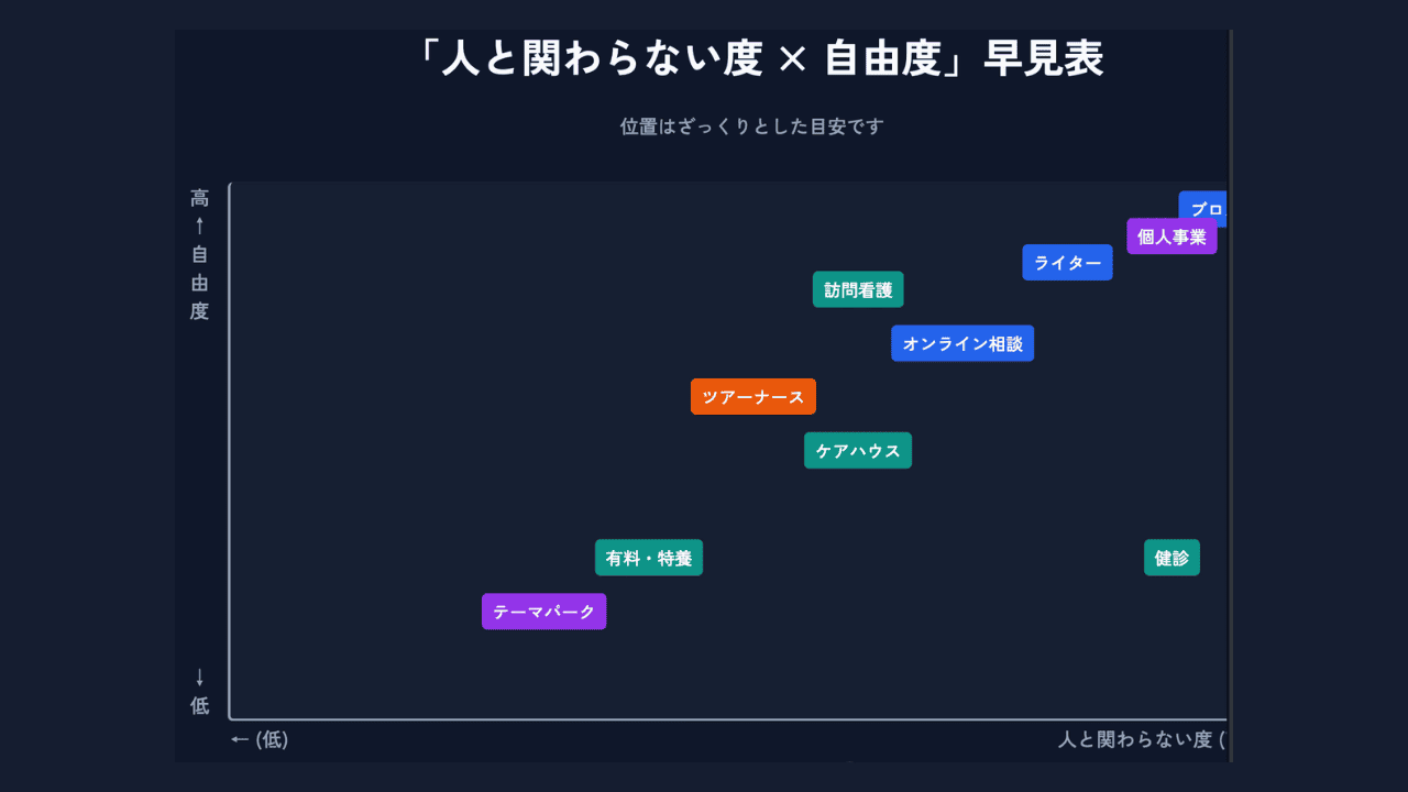 - 「人と関わらない度 × 年収イメージ × 自由度」のざっくり目安