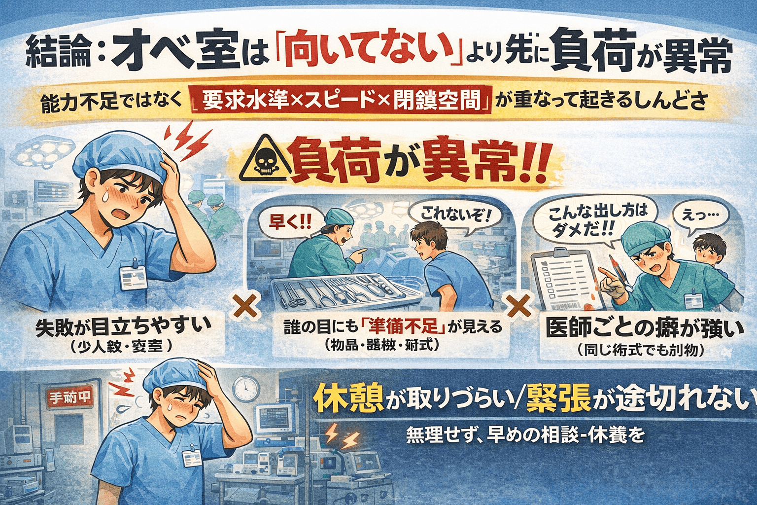 オペ室のしんどさは、能力不足ではなく 「要求水準×スピード×閉鎖空間」が重なって起きます。