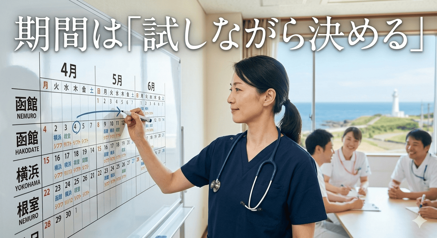 「3ヶ月で希望を出したら、病院側から4ヶ月でお願いしますと打診された」——これが現実です。看護基準の関係で病院側にも都合があります。でも最終的に合意したのは私自身。どこで・いつから・何ヶ月働くかを決める権限は、常に自分にあります。